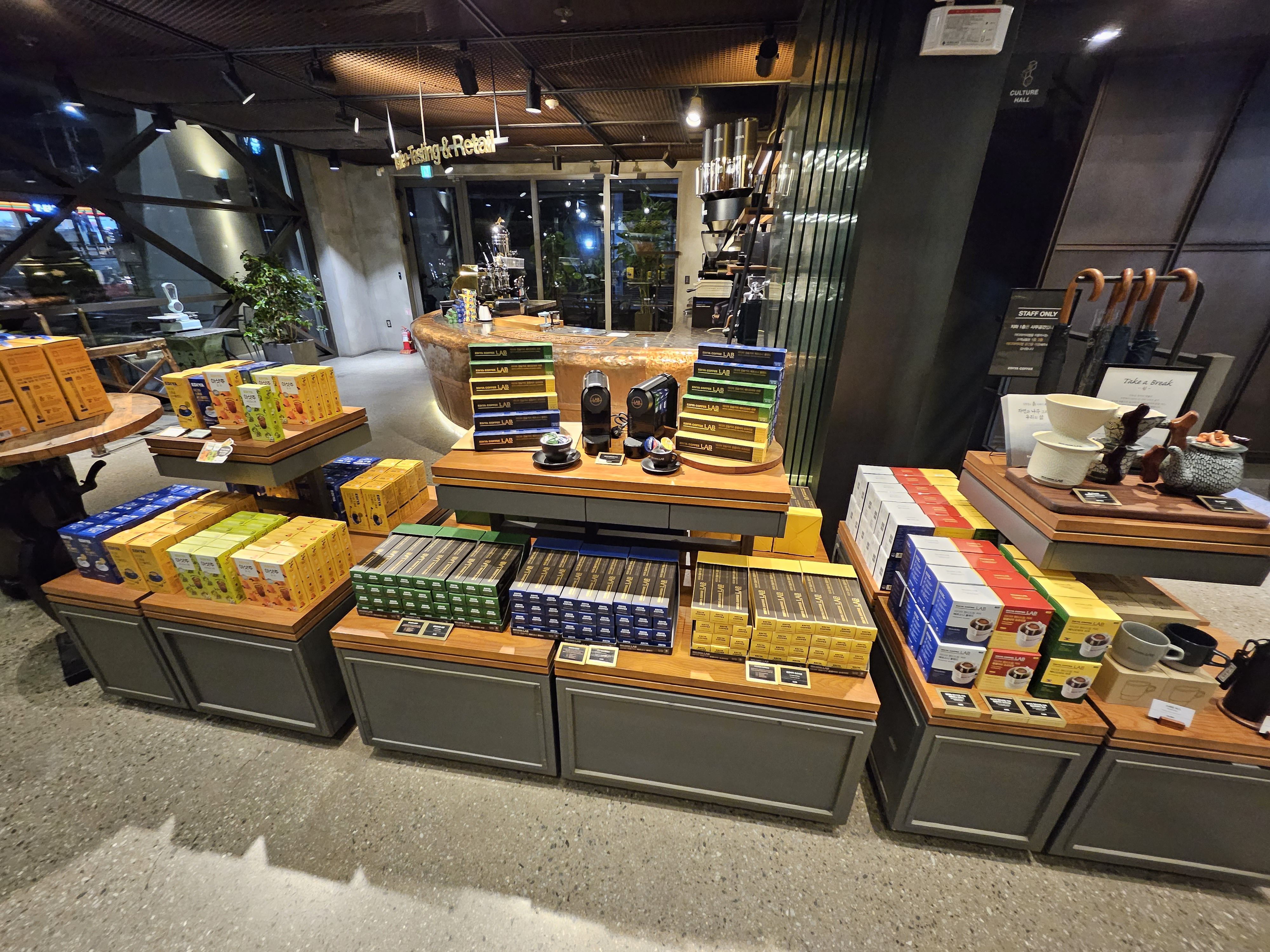 입구에서 바로 왼쪽에는 커피 테이스팅 및 커피 관련 제품들이 전시 되어 있다.