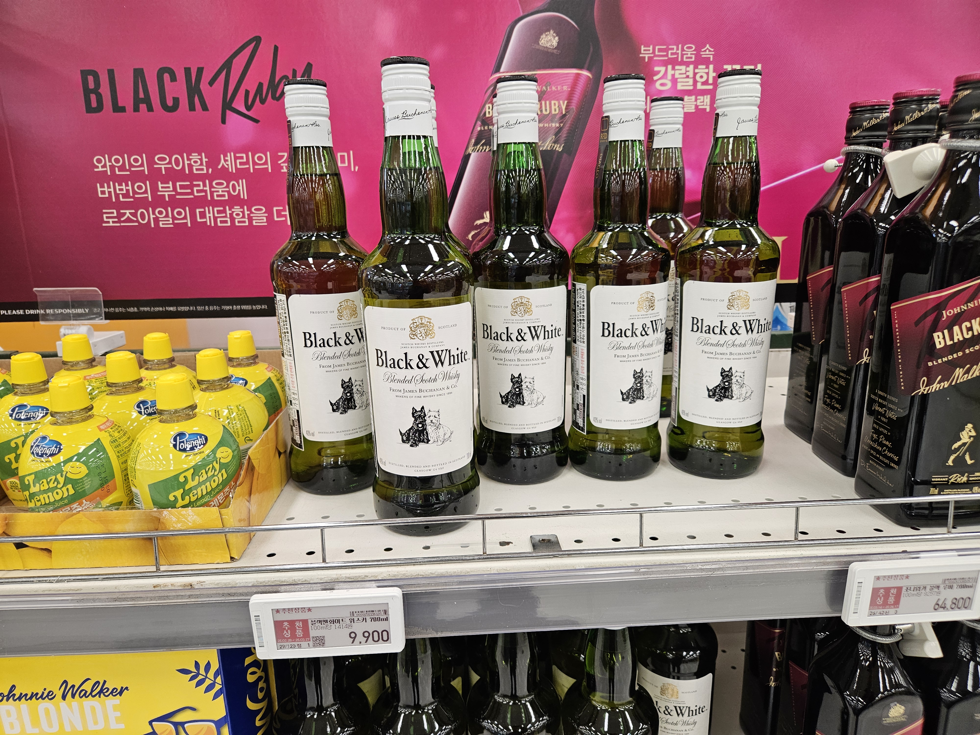 랭스는 롯데마트에서 9,900원에 판매되는 가성비 스카치 위스키인데 이에 대항하듯 이마트에서도 블랙앤화이트 스카치위스키를 9,900원에 판매하고 있다.