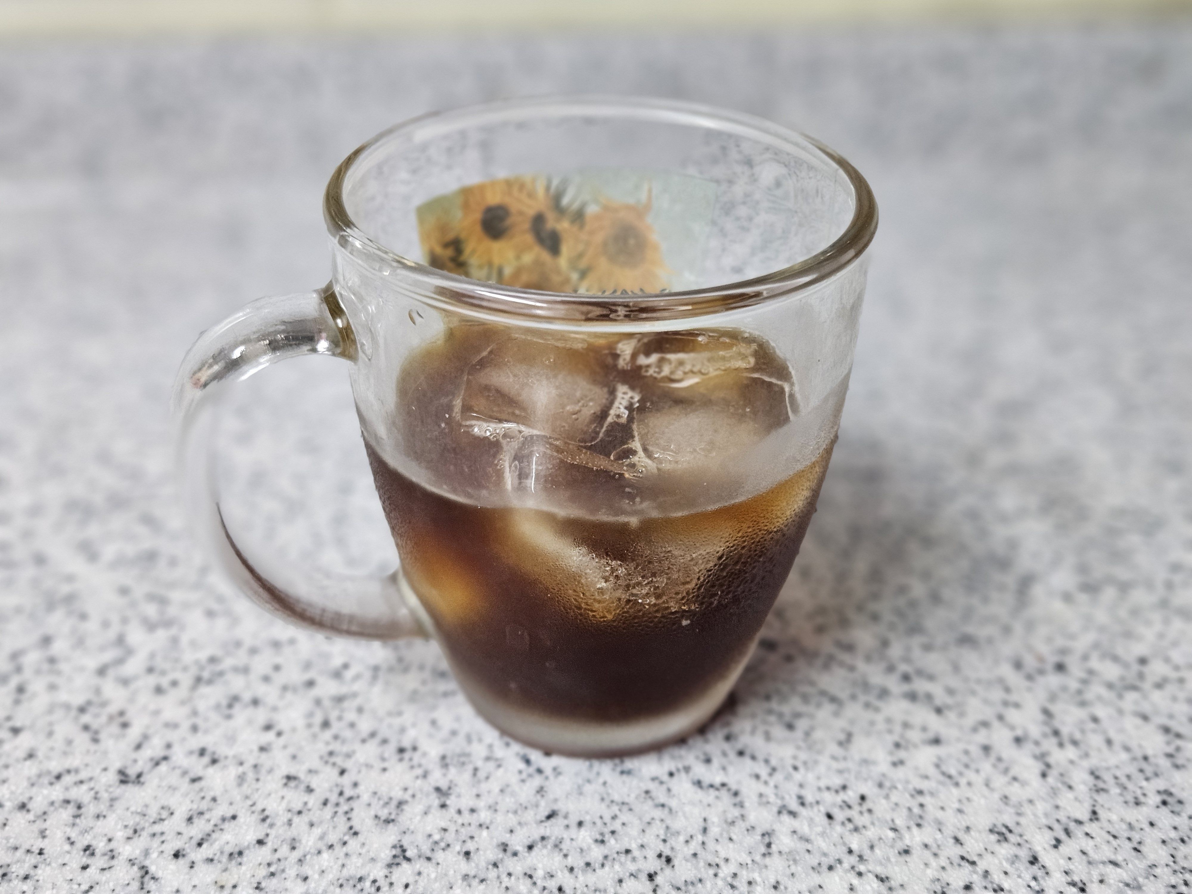 찬물에 녹인 일리 클래식 로스트 디카페인 커피를 얼음잔에 따라서 마셨다.