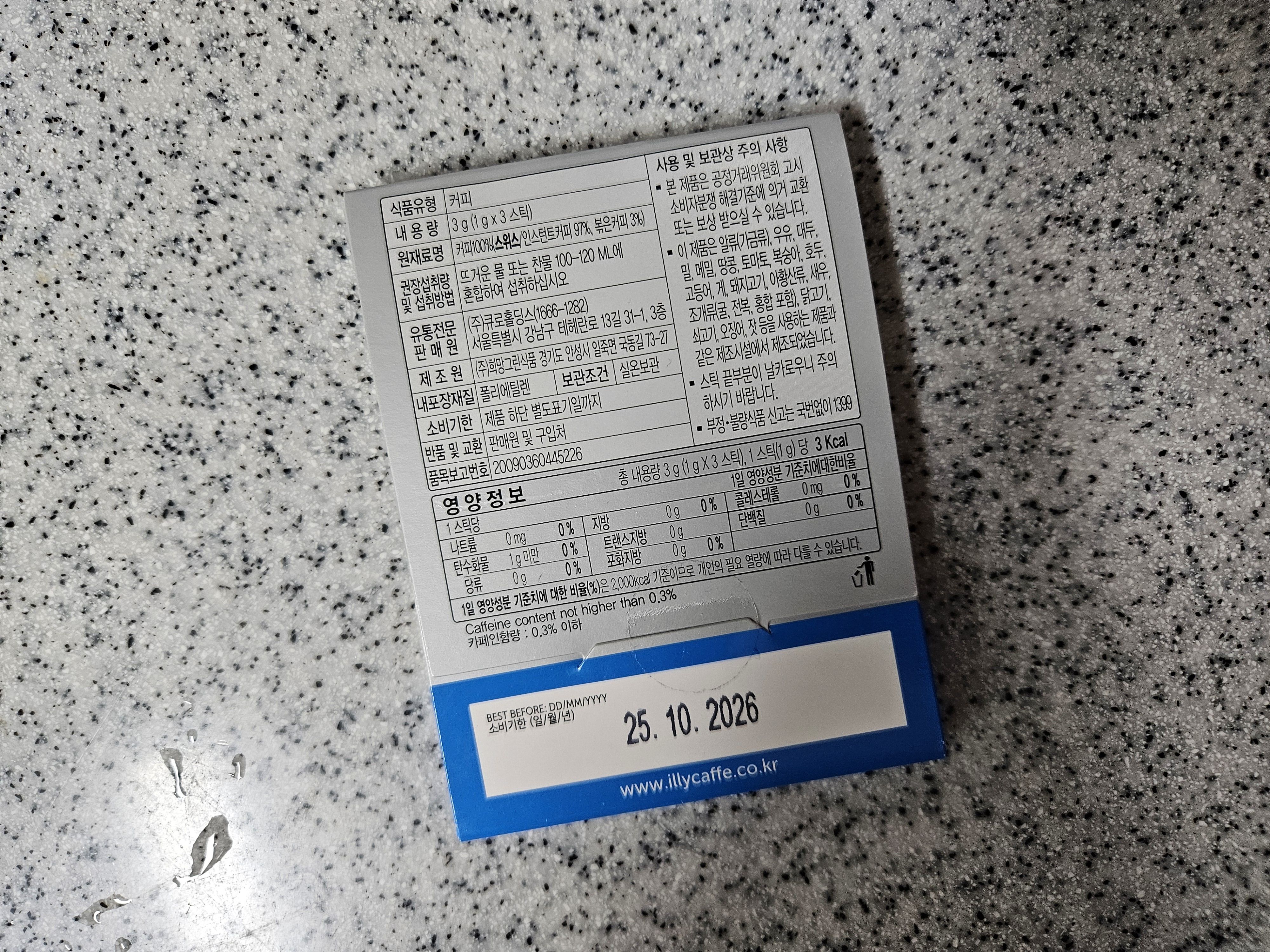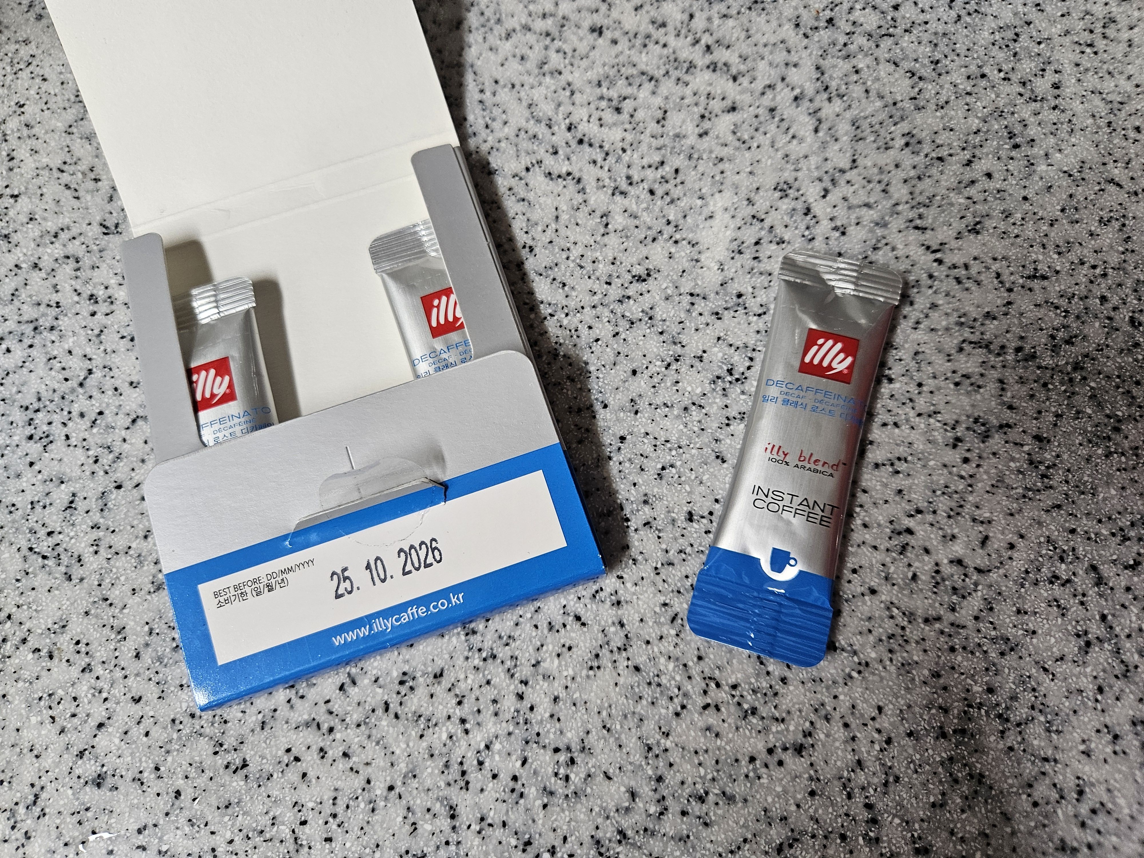 커피스틱이 3개가 들어 있는 제품은 판매용이 아니라 사은품으로 제작된 제품인 거 같은데 그럼에도 일리답게 포장은 꽤 고급스럽다. 제품을 열자 유통기한은 1년 넘게 넉넉하게 남아 있다.