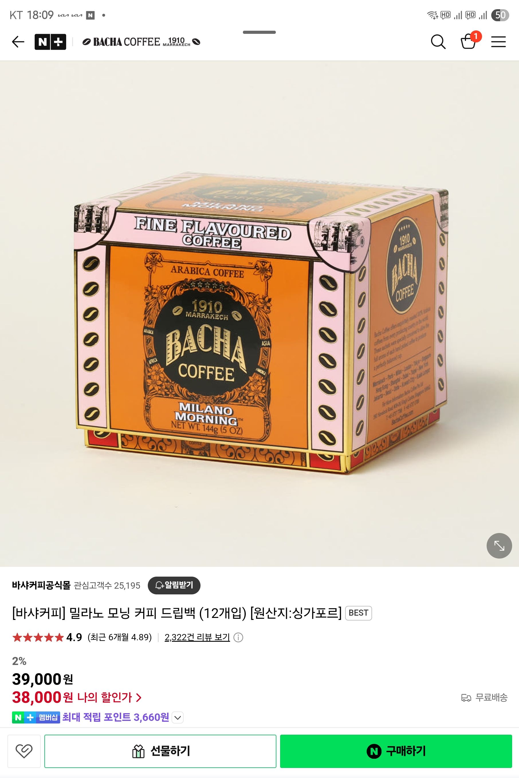 바샤 밀라노 모닝 커피 드립백은 싱가포르 매장이나 면세점에서도 12개/Box가 SD $32~35 가 넘는다고 하는데 국내 바샤 공식몰에서는 39,000원이다. 싱달러로 계산해도 한잔에 거의 3천 원 가까이하고 국내 가격으로 하면 개당 3,250원이다.