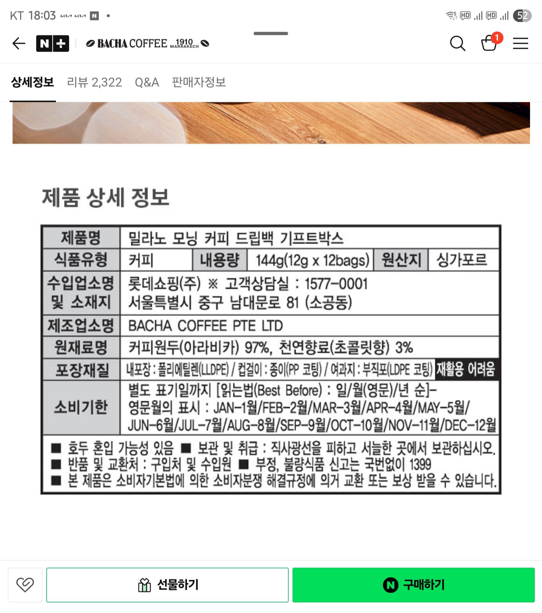 나는 제품 하나만 가지고 있어서 상품설명을 볼 수 없었지만 바샤커피 공식몰의 제품 상세설명을 보니 초콜릿향이 3%나 들어 있는 것을 알 수 있었다.