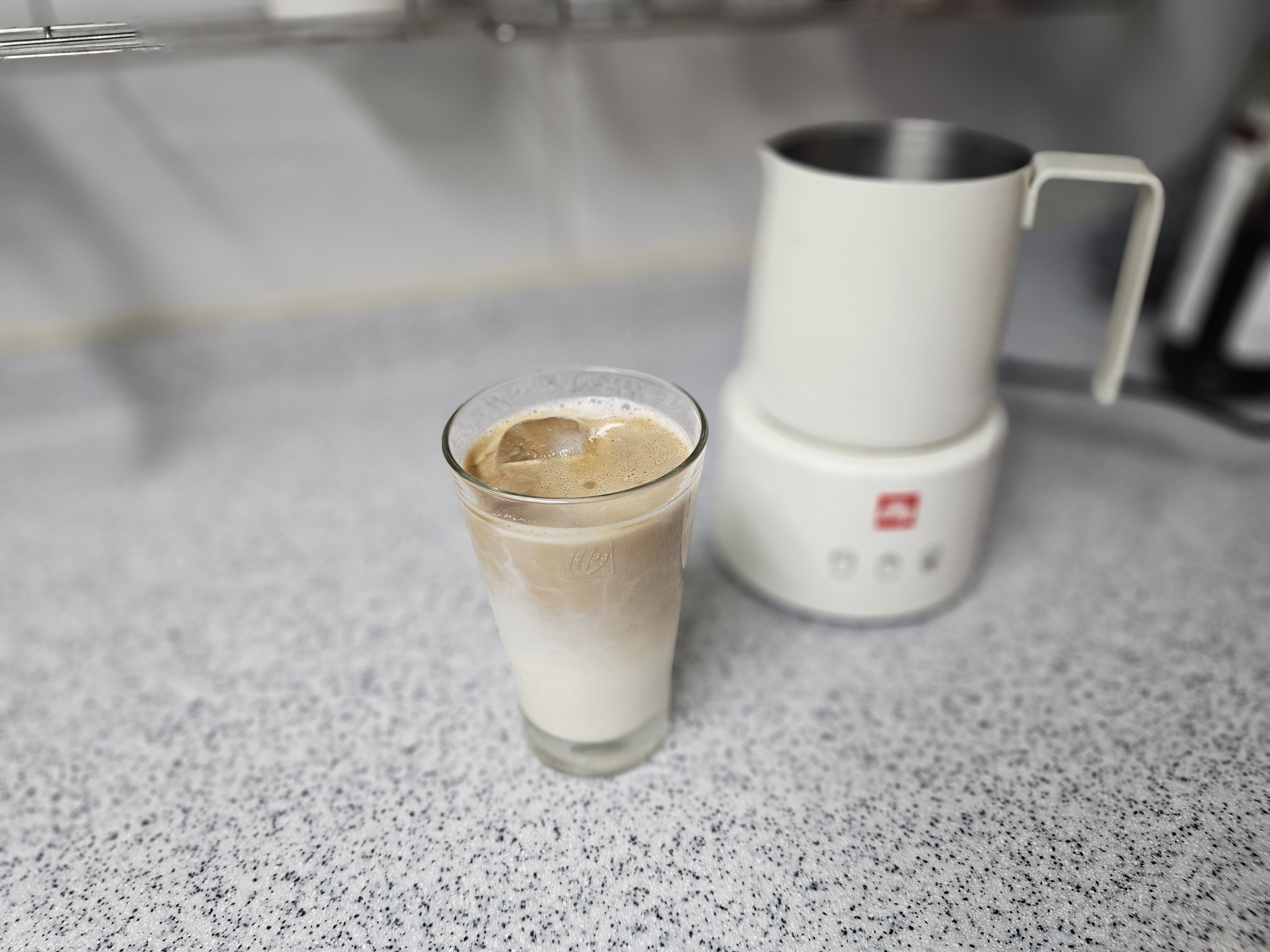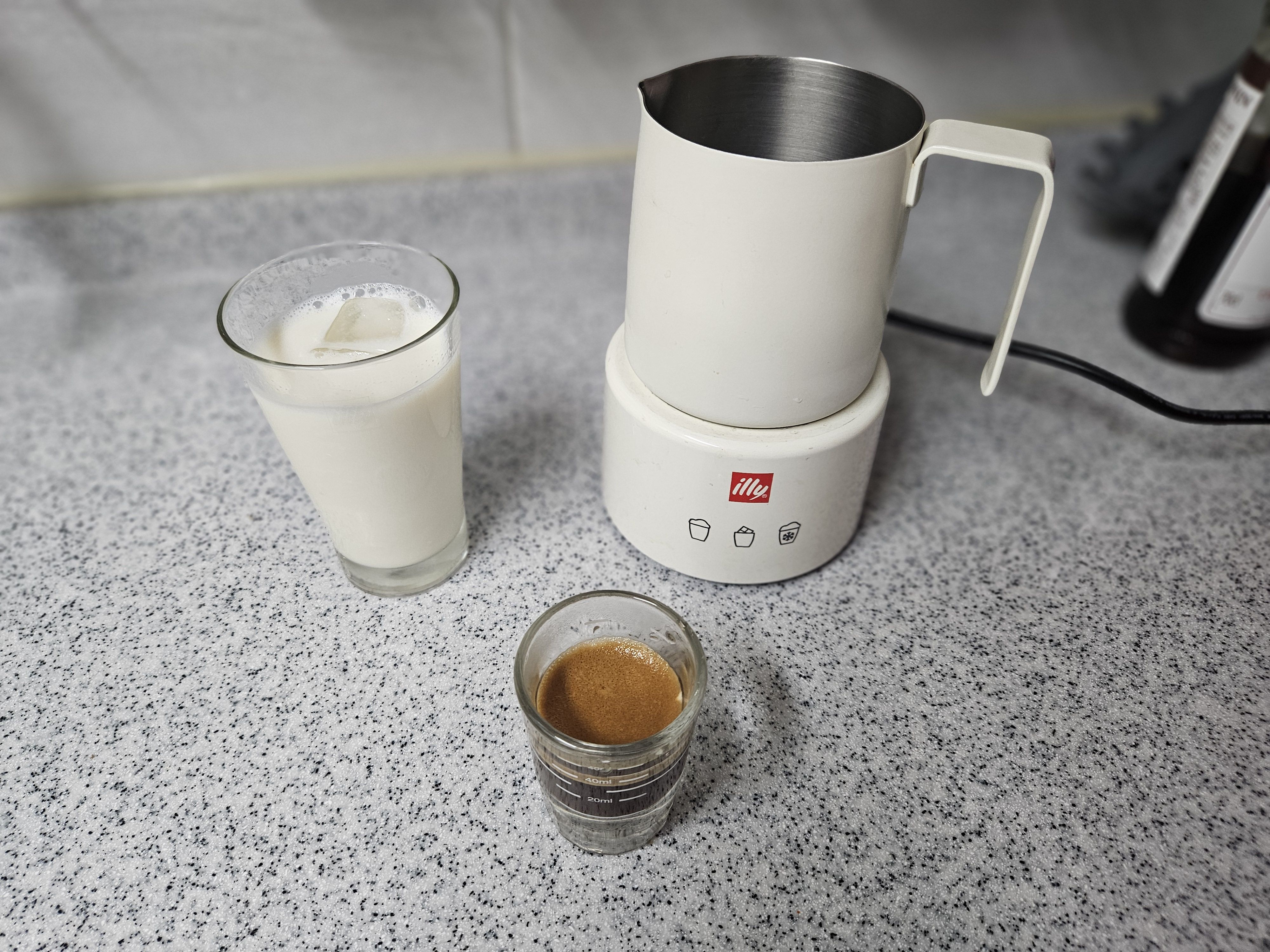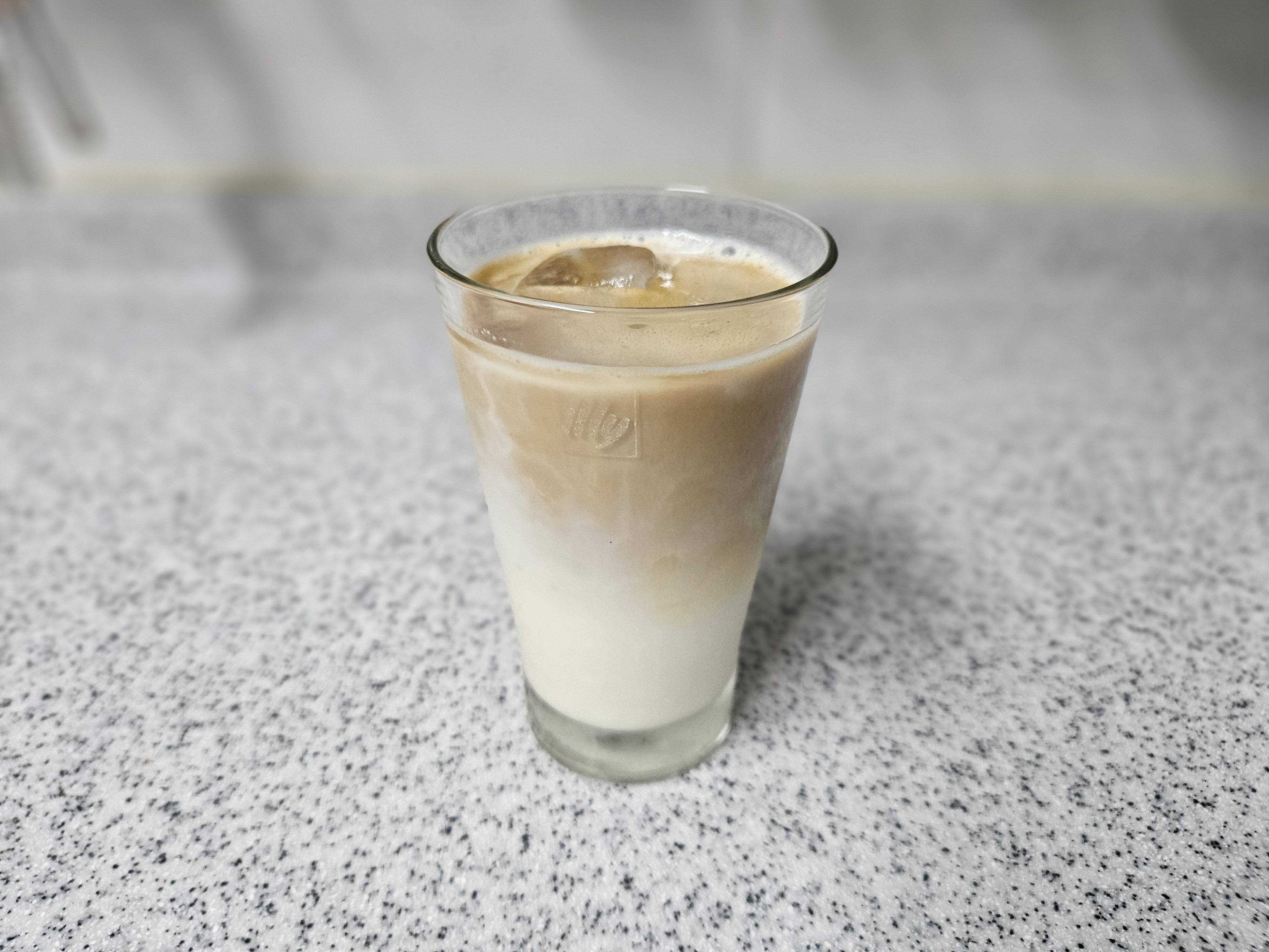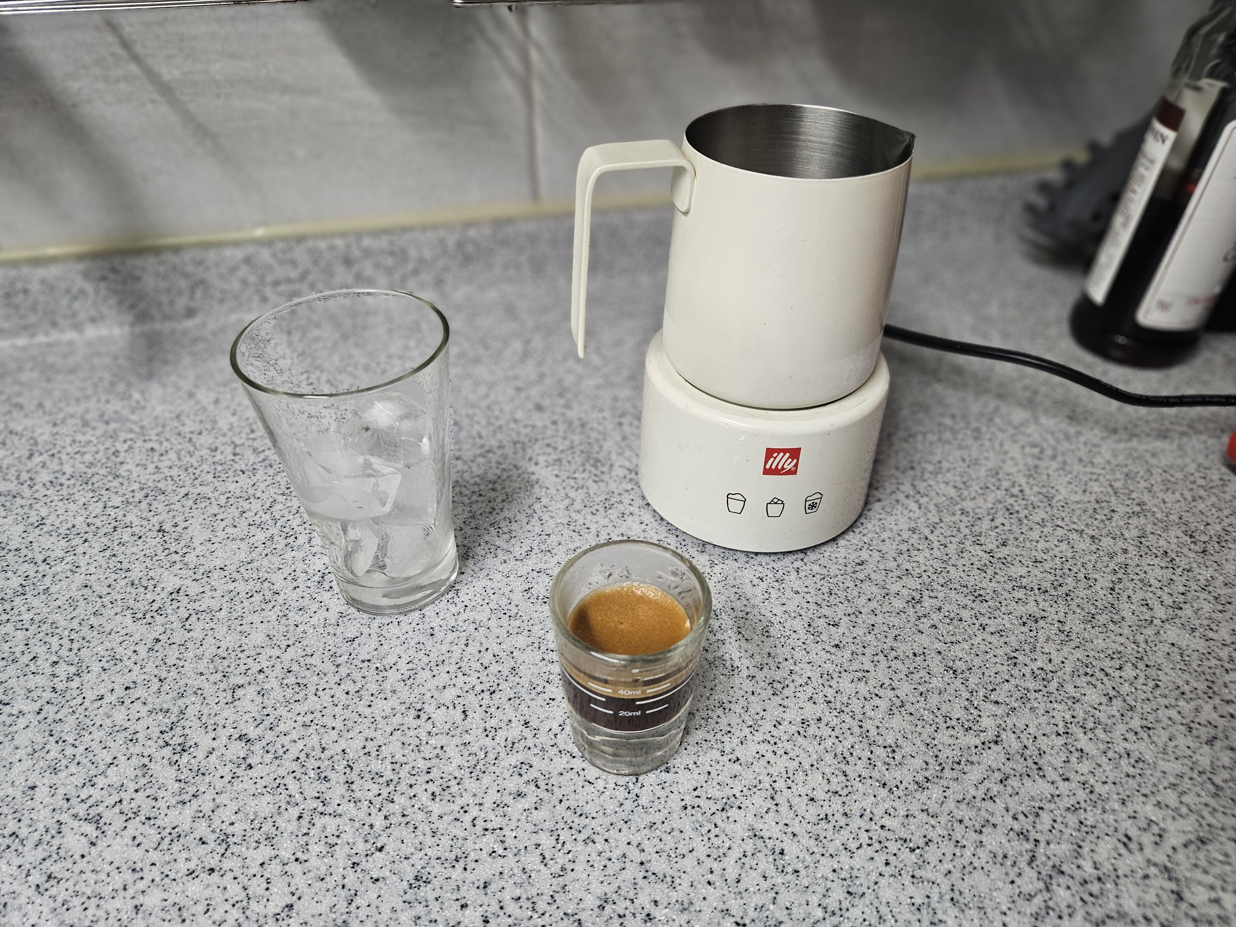 일리 라테 글라스이니 에스프레소 샷을 뽑고 얼음을 글라스에 넣고 아이스 라테를 만들어 봤다.