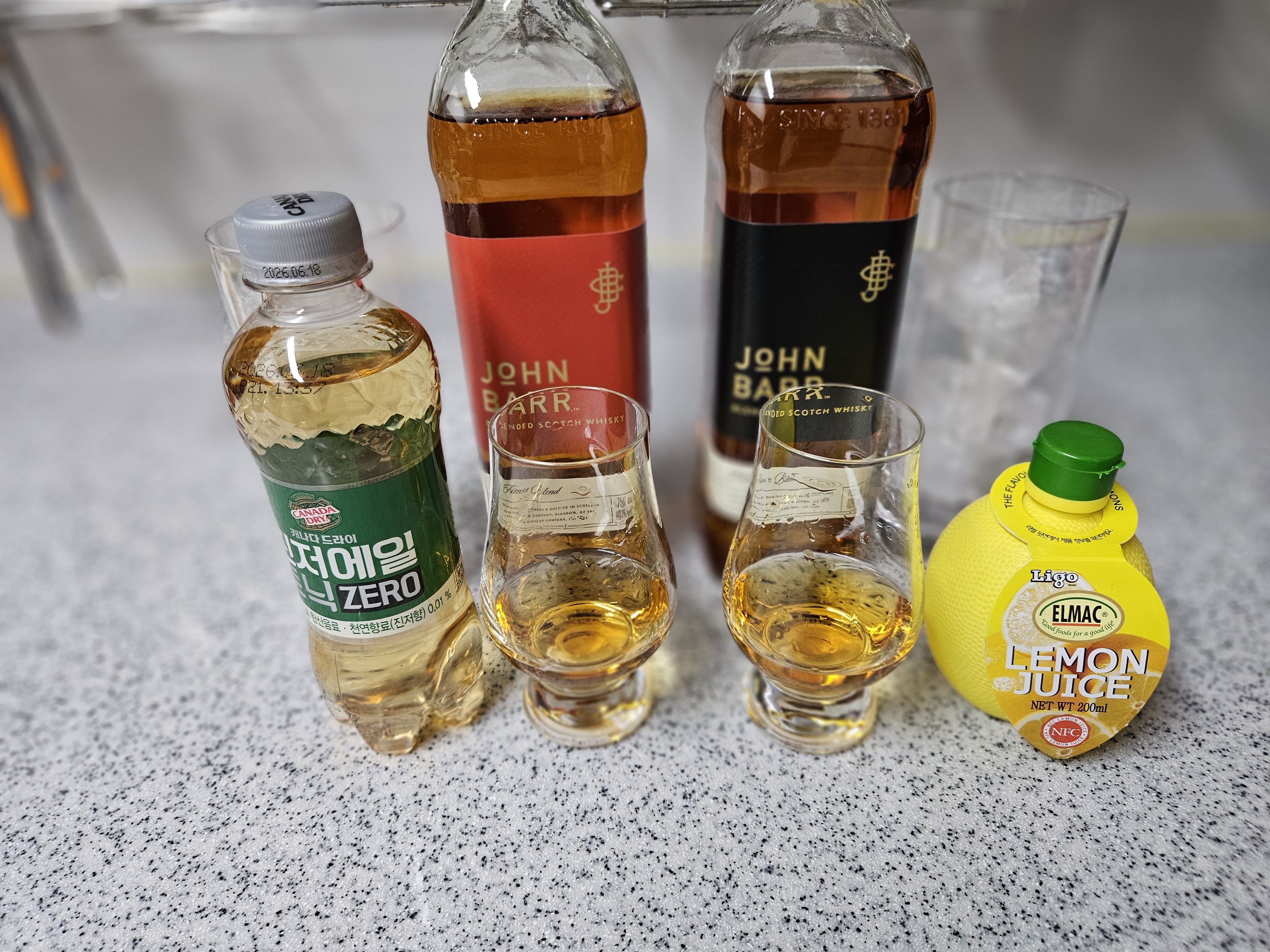 글렌캐런 잔에 따른 위스키를 하이볼 잔에 넣고 캐나다 드라이 진저에일 제로를 채워주고 마지막에 엘막 레몬주스를 살짝 넣어서 완성을 했다.